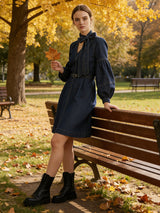 Minikleider mit langen Puffärmeln, Gürtel und Schleifenverzierung in Unifarbe mit V-Ausschnitt