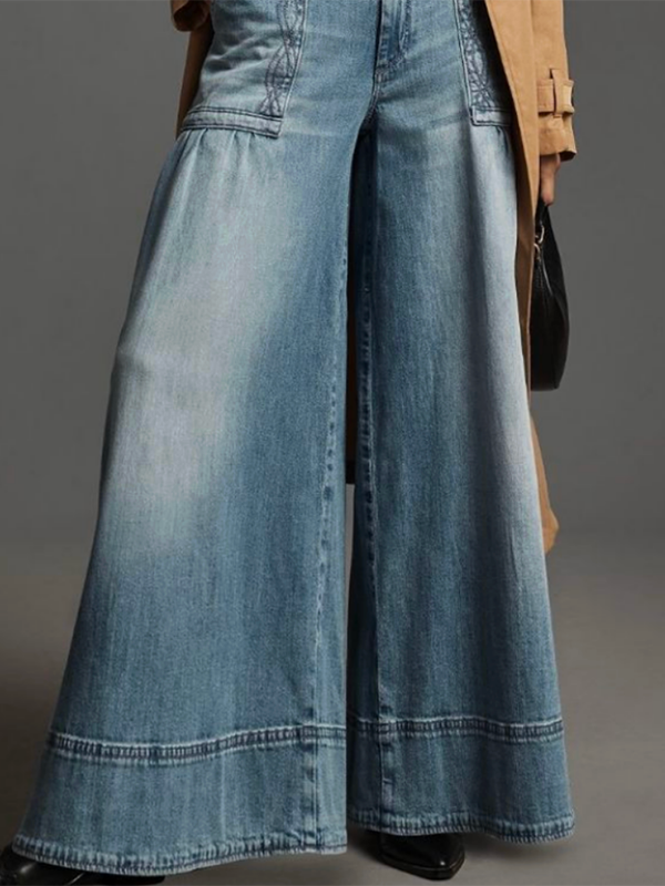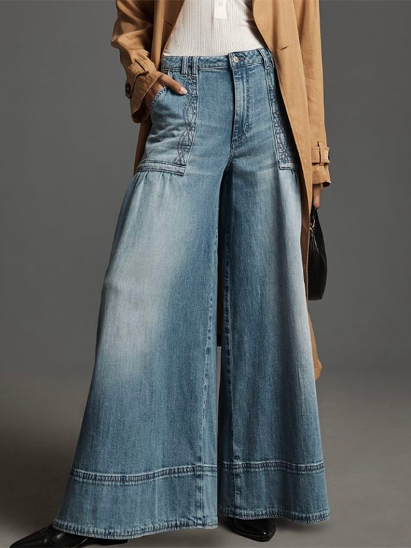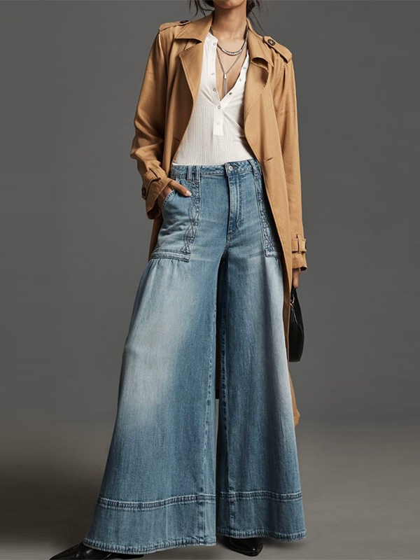 Wide Leg Buttoned Pockets Solid Color Split-Joint Zipper Jean Pants Bottoms Trousers