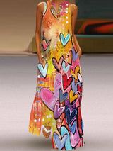 Vestidos maxi de cuello redondo de estampado de corazón suelto de línea A
