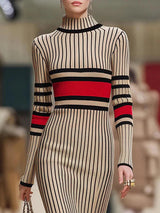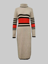 Long Sleeves Skinny Contrast Color Striped High Neck Midi Dresses Sweater Dresses