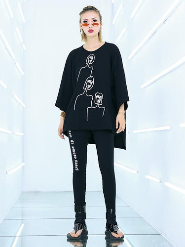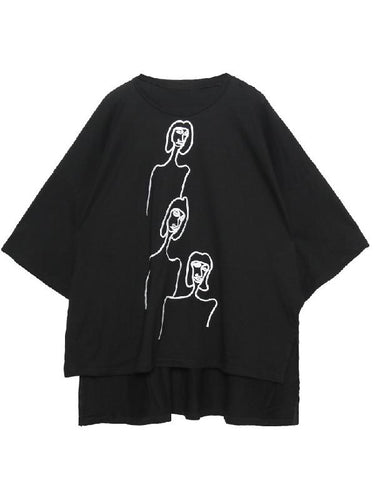 Camiseta bordada en blanco y negro suelto de cuello redondo