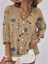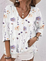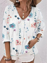 Mangas largas Topas y camisas de cuello en V con estampado de flores en bote