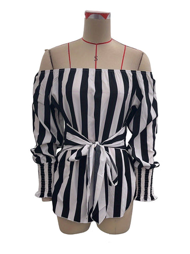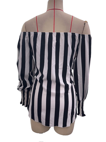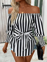 Mangas largas Color de contraste suelto elasticidad División de articulación División Ajusta a rayas Blusas y camisas fuera de los hombros
