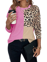 Mangas largas Color de leopardo de contraste suelto Camisetas de cuello redondo dividido
