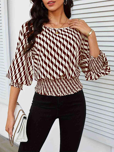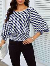 Mangas sueltas de las mangas de hojaldre la elasticidad impresa con las camisas de las blusas de cuello redondo de unión