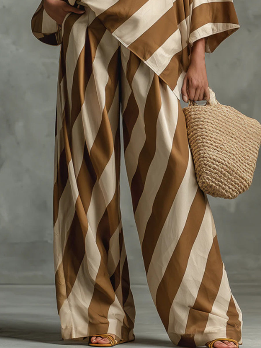 Contrast Color Split-Joint Striped Batwing Sleeves One-Shoulder Blouses&Shirts Tops + High Waisted Pockets Trousers Pants Two Pieces Set