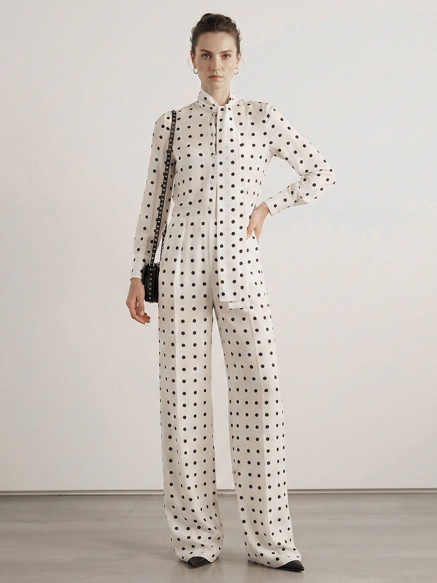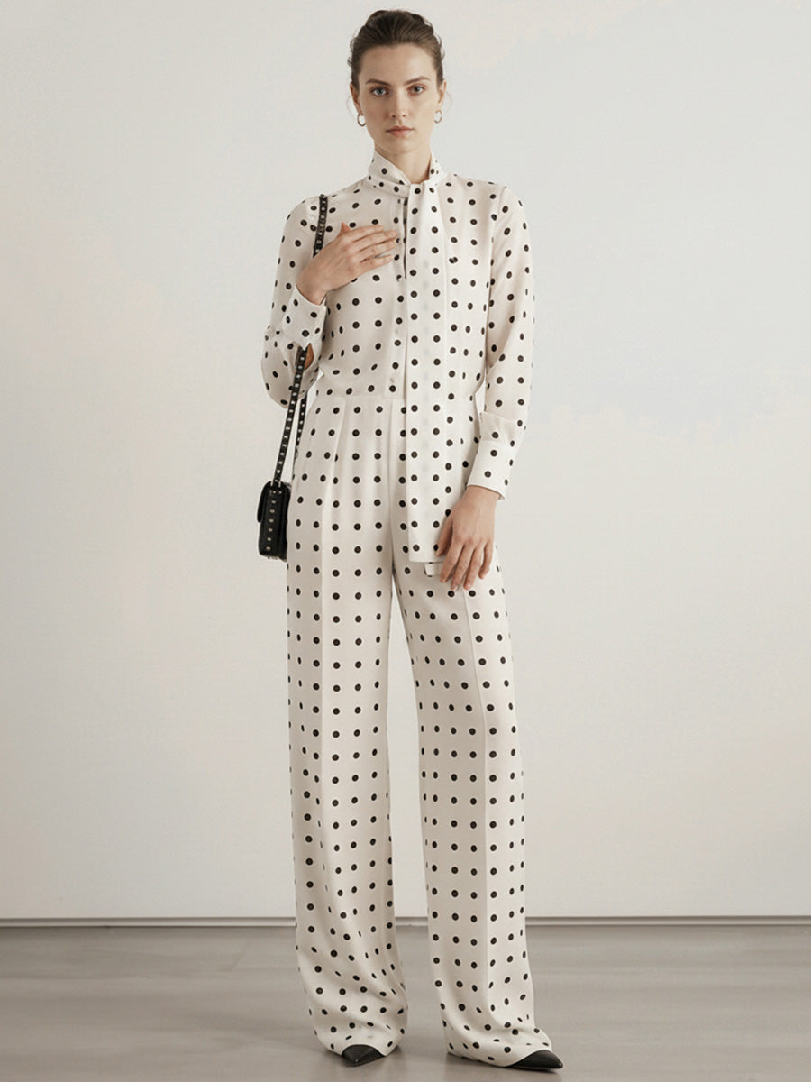 Long Sleeves Skinny Contrast Color Polka-Dot Split-Joint Streamer Scarf Collar Jumpsuits