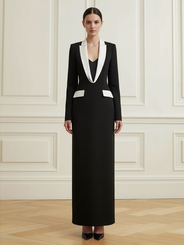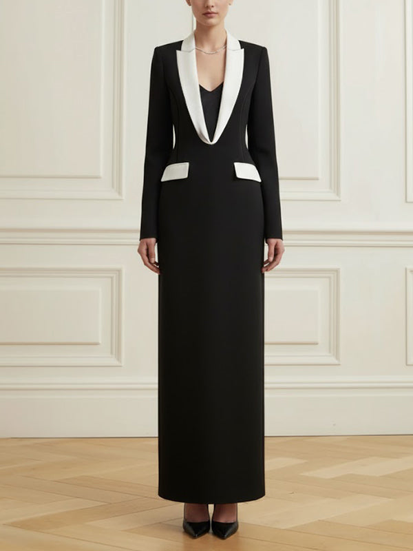 Long Sleeves Contrast Color Deep V-Neck Maxi Dresses