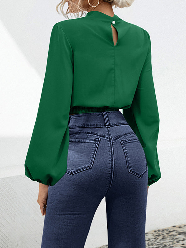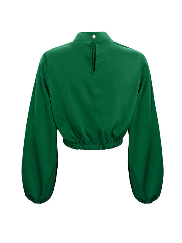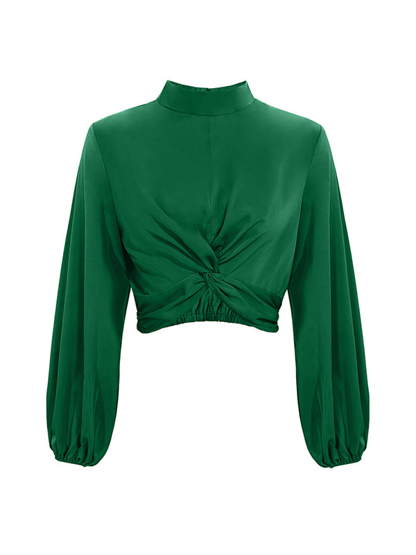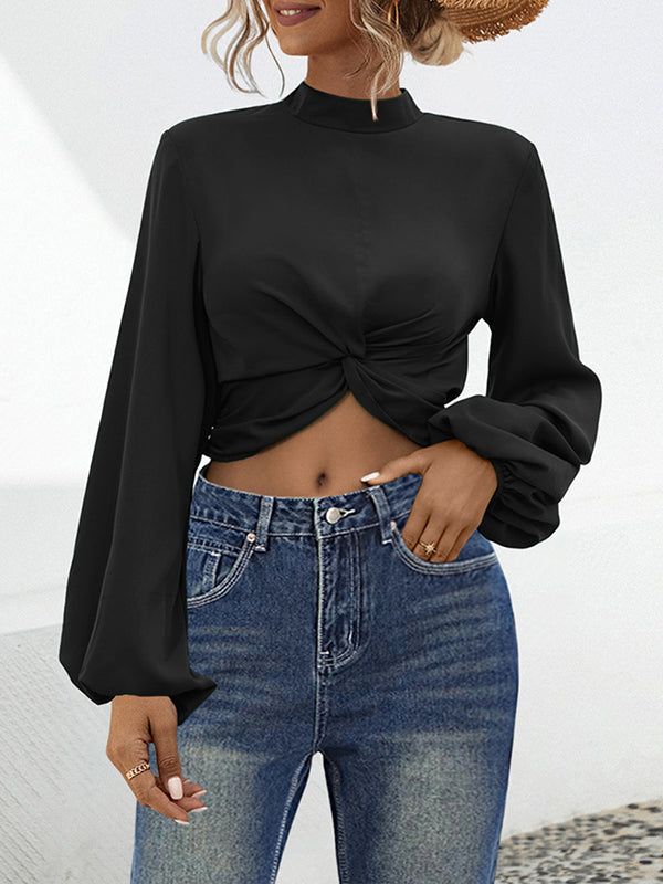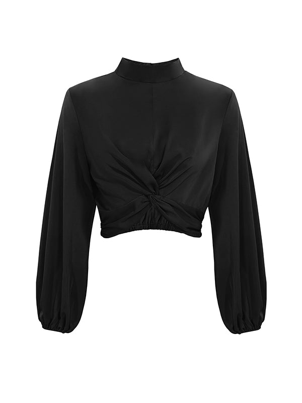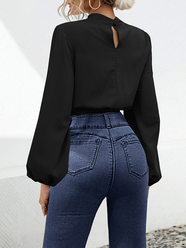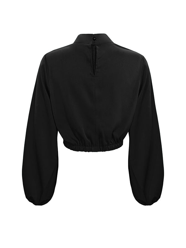 Long Sleeves Puff Sleeves Elasticity Hollow Knot Pleated Ruffled Mock Neck Blouses&Shirts Tops