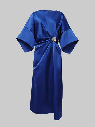 Loose Three-Quarter Sleeves Asymmetric Pleated Split-Joint Round-Neck Maxi Dresses