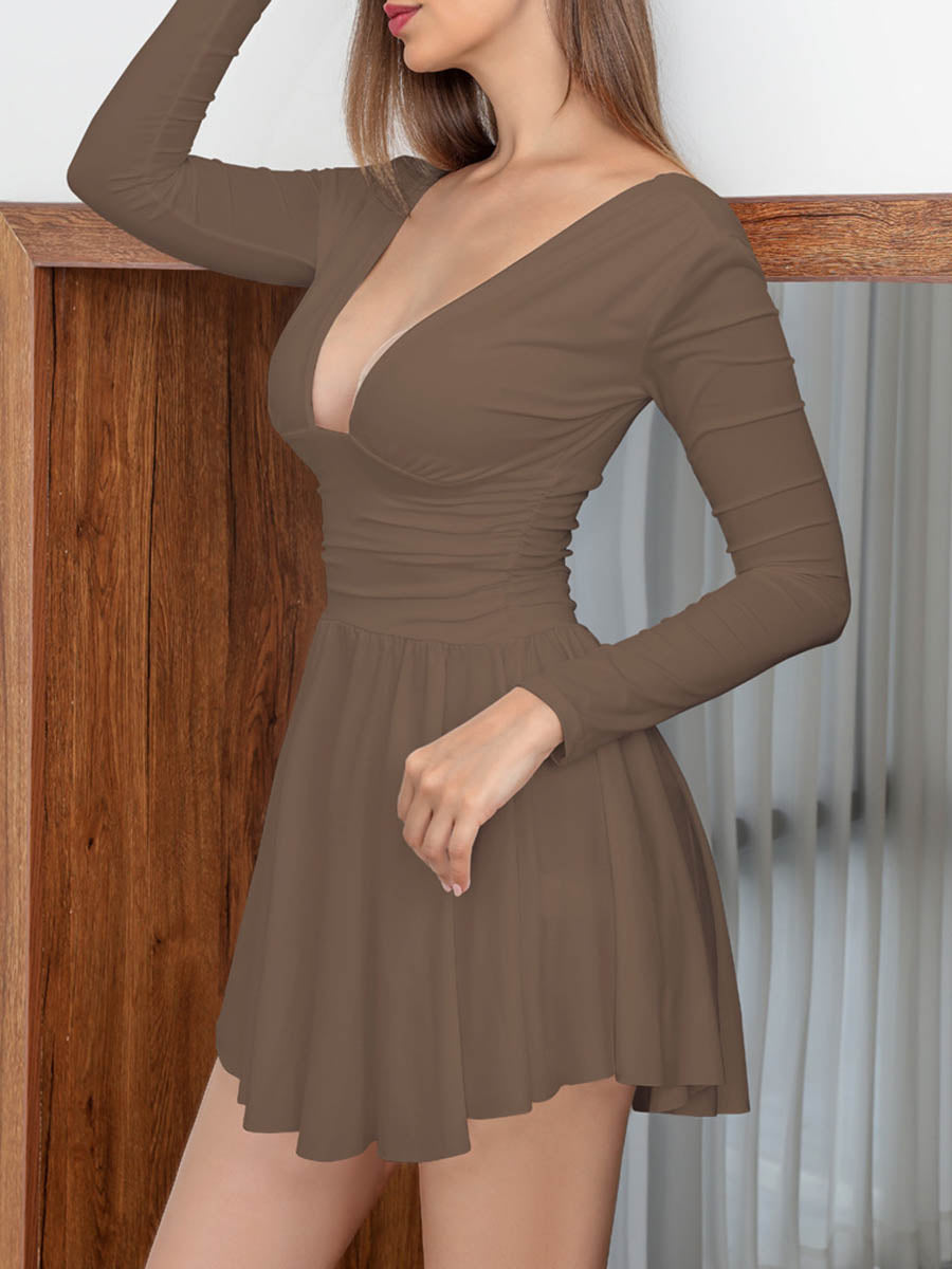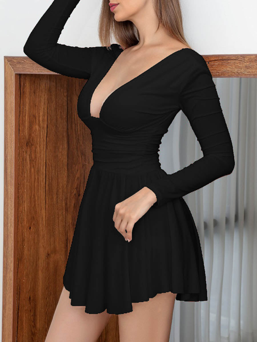 A-Line Elasticated Waist Backless Pleated Solid Color Split-Joint Deep V-Neck Mini Dresses
