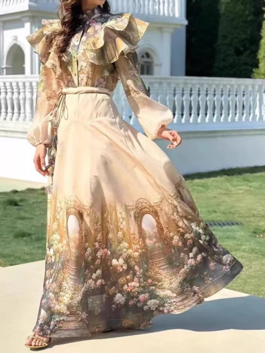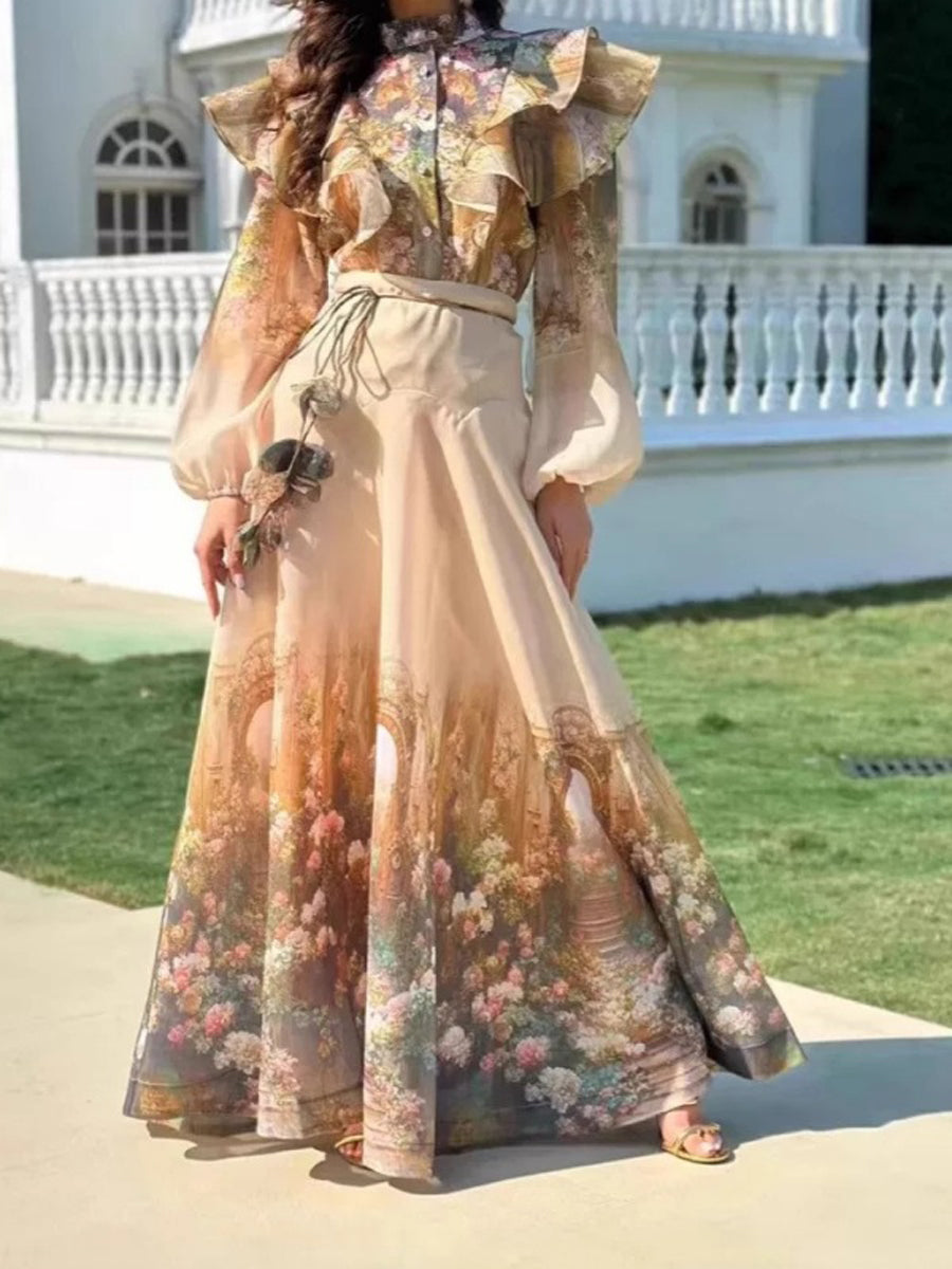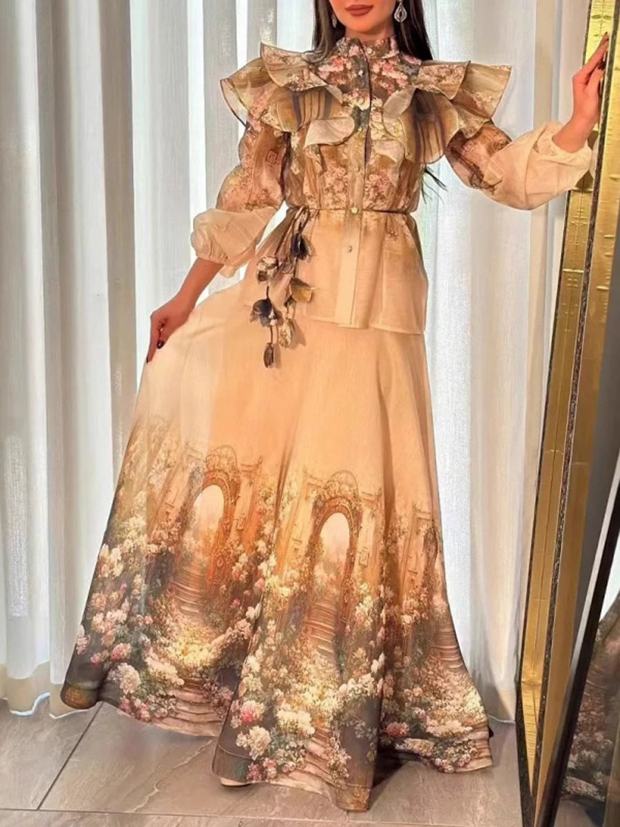 A-Line Long Sleeves Flower-Embellished Buttoned Flower Print Ruffled Half Turtleneck Sets Two-Piece Sets