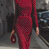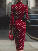 Bodycon High Waisted Belted Contrast Color Polka Dot Split-back Split-Joint Zipper Mock Neck Midi Dresses