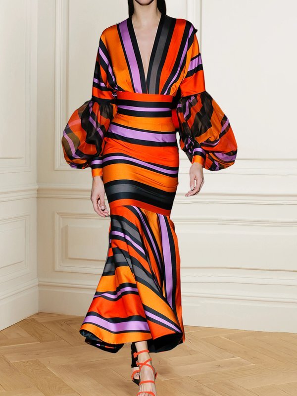 Bodycon Long Sleeves Contrast Color Split-Joint Striped Deep V-Neck Maxi Dresses