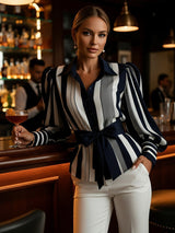 Elasticated Waist High Waisted Belted Bow-Embellished Buttoned Contrast Color Split-Joint Striped Lapel Blouses&Shirts Tops