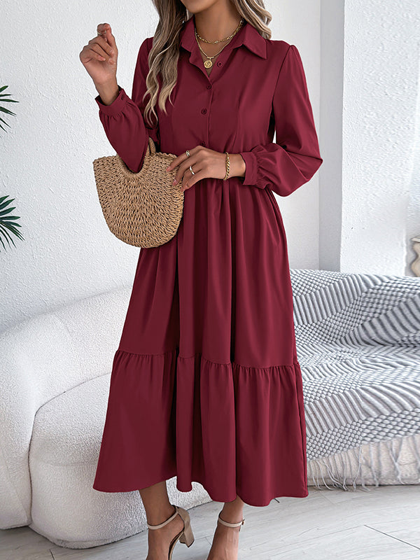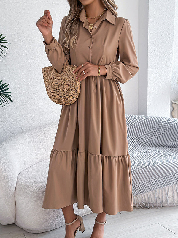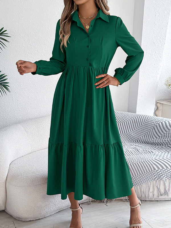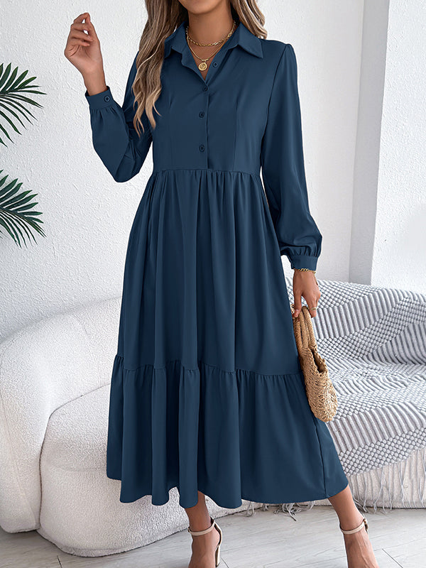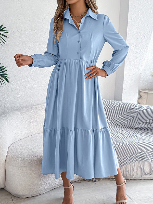 High Waisted Long Sleeves Pleated Ruffled Solid Color Lapel Midi Dresses Shirt Dress
