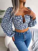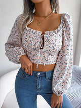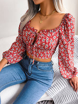 Maniche a maniche vescovi a maniche lunghe elasticità stampa floreale legate a scollo a V profonde camicette e camicie