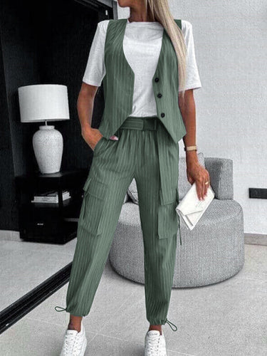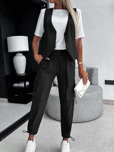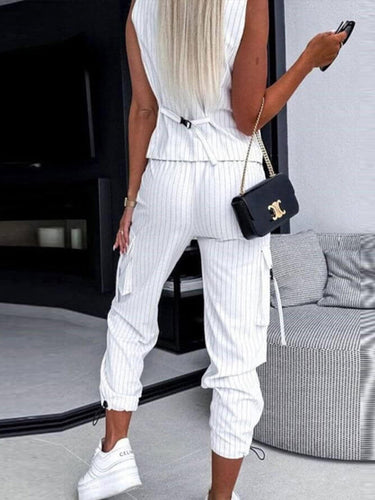 Giubbotto a v-collo a strisce a strisce sciolte top + tasche corse nona pantaloni pantaloni pieghettati in basso due pezzi impostati