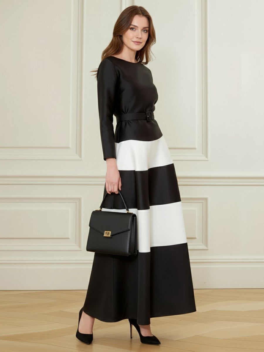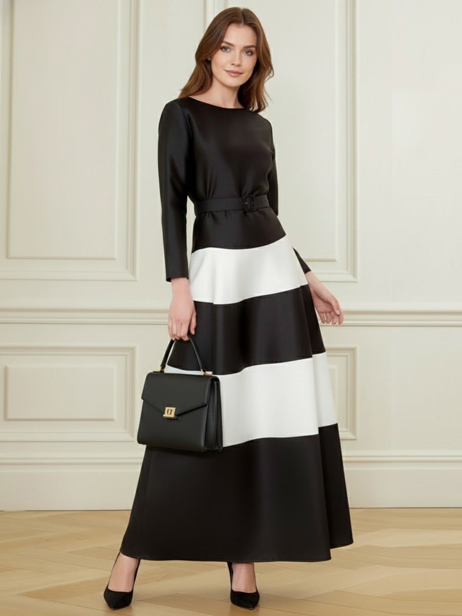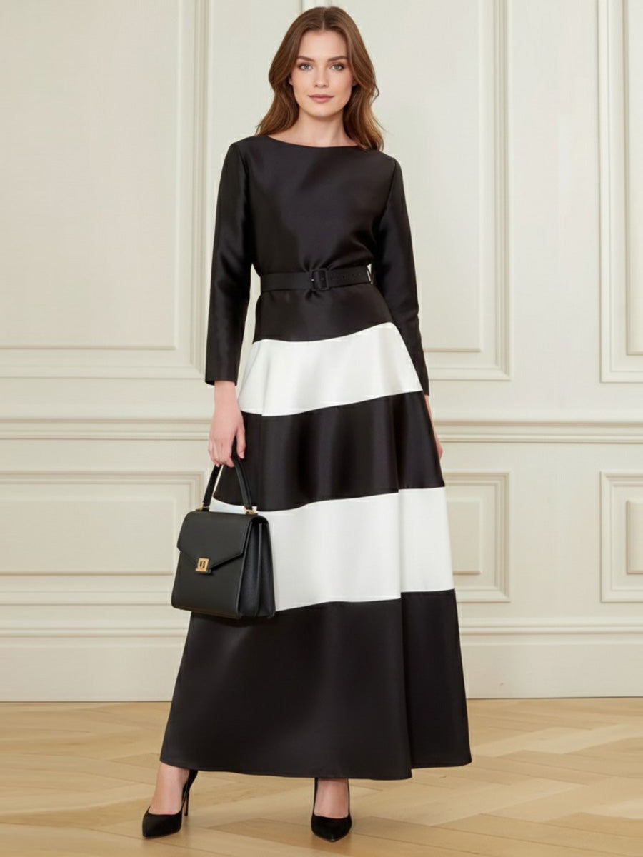 A-Line Bodycon Belted Contrast Color Split-Joint Round-Neck Maxi Dresses