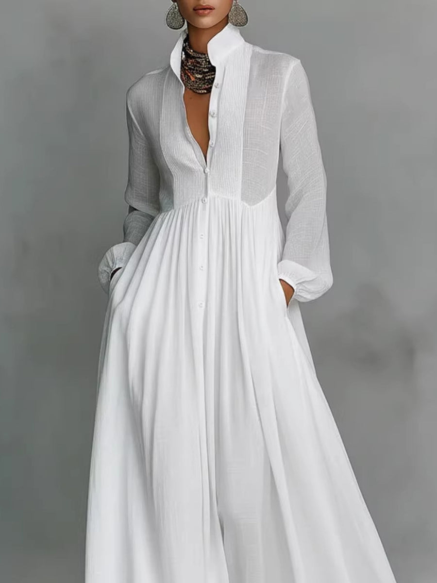 A-Line High Waisted Buttoned Pleated Pockets Solid Color Split-Joint Stand Collar Maxi Dresses Shirt Dress