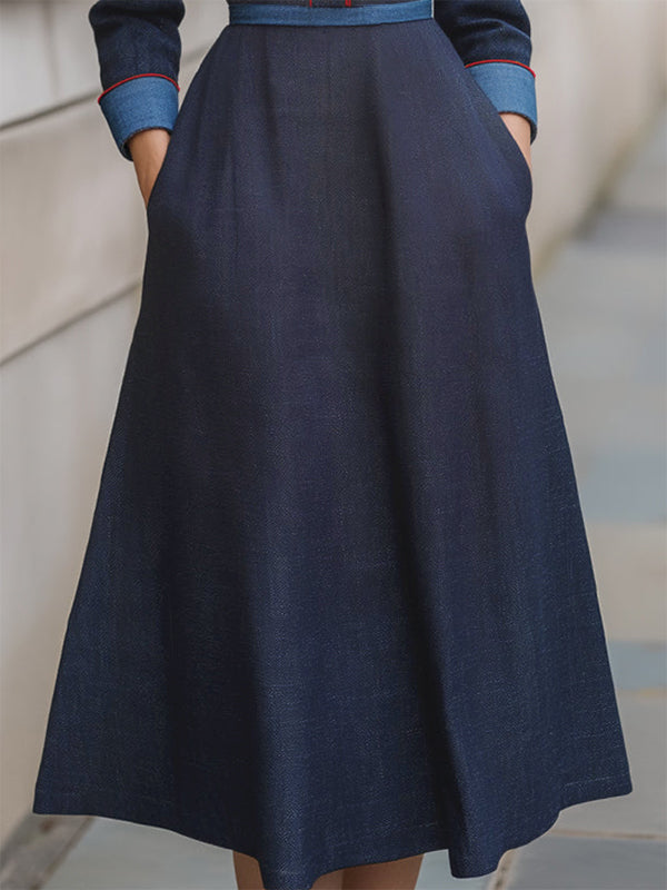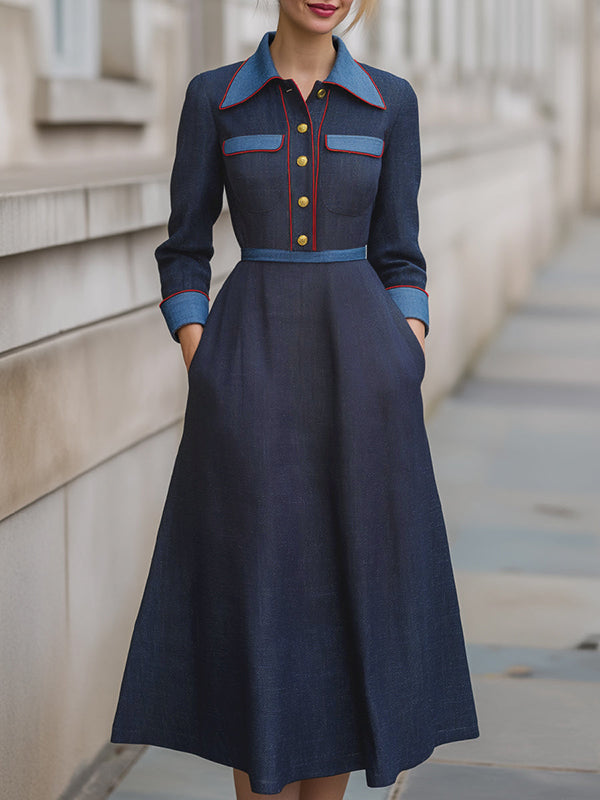 A-Line High Waisted Buttoned Pockets Solid Color Split-Joint Lapel Midi Dresses