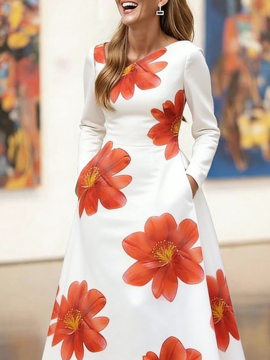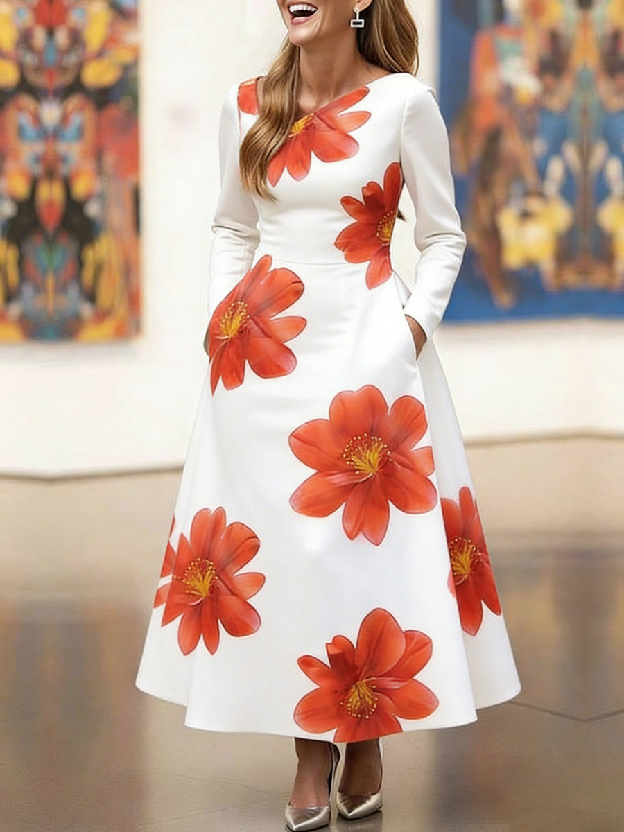 A-Line Long Sleeves Flower Print Pockets Split-Joint Asymmetric Collar Maxi Dresses