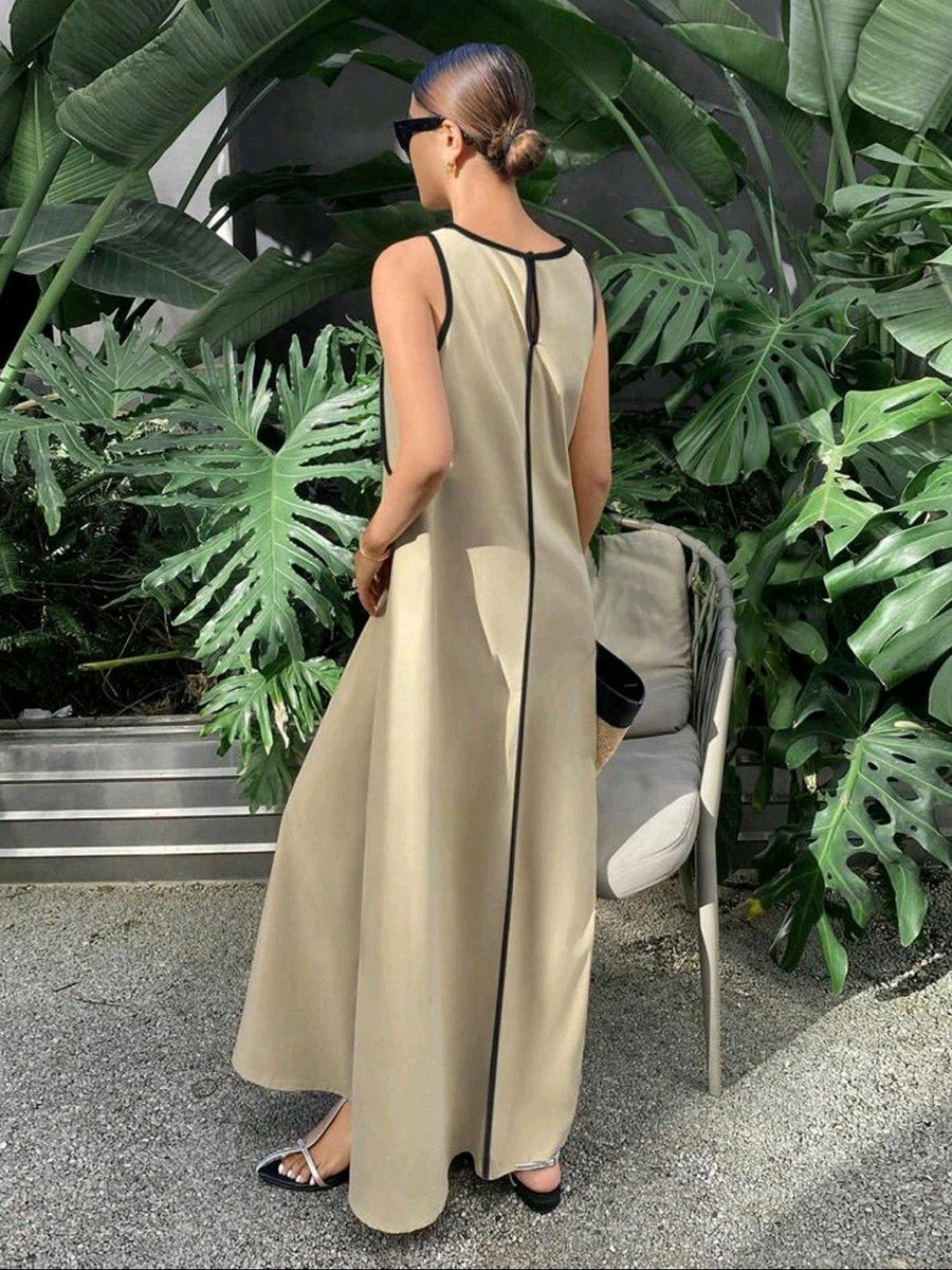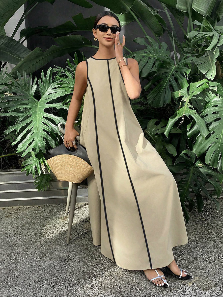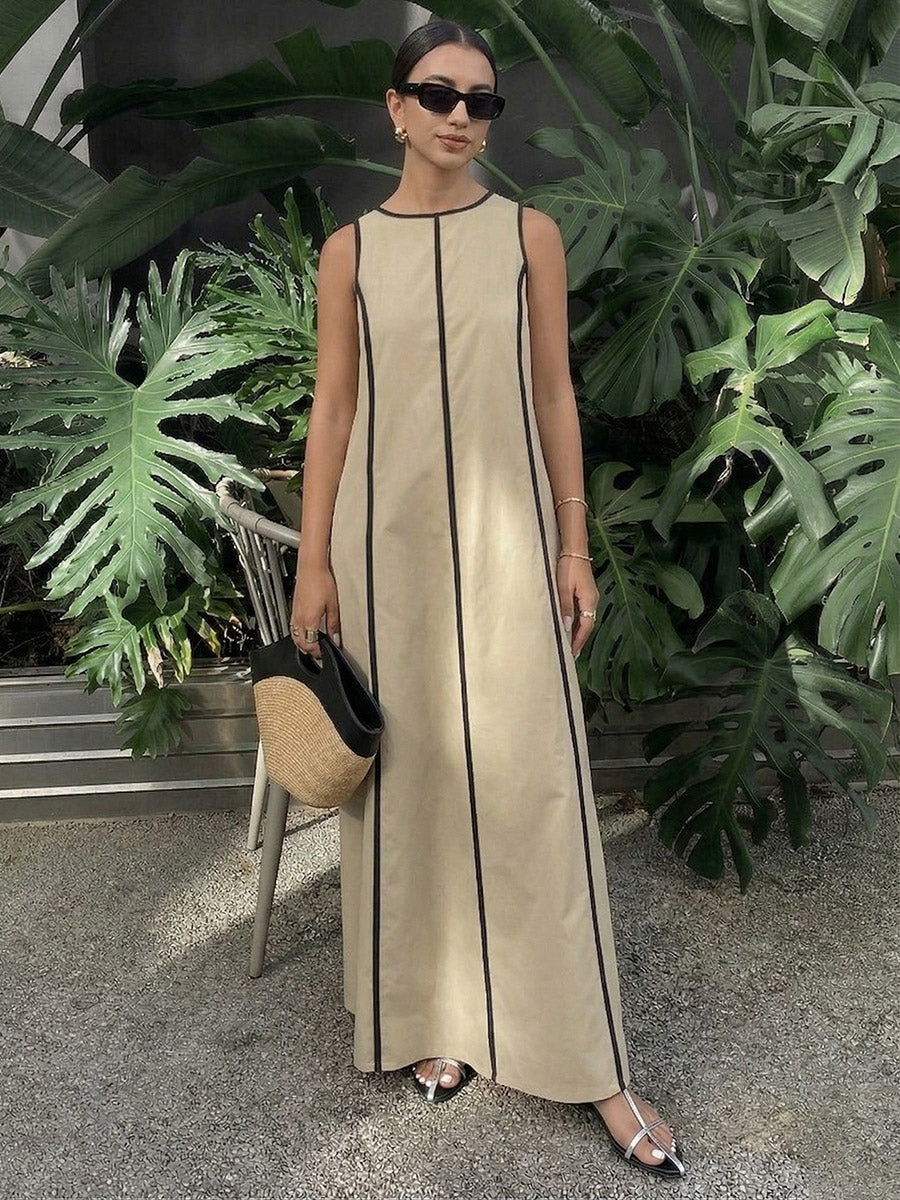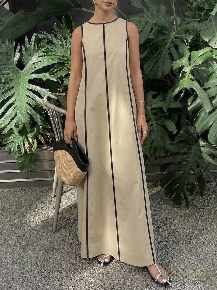 A-Line Loose Contrast Color Line Round-Neck Maxi Dresses