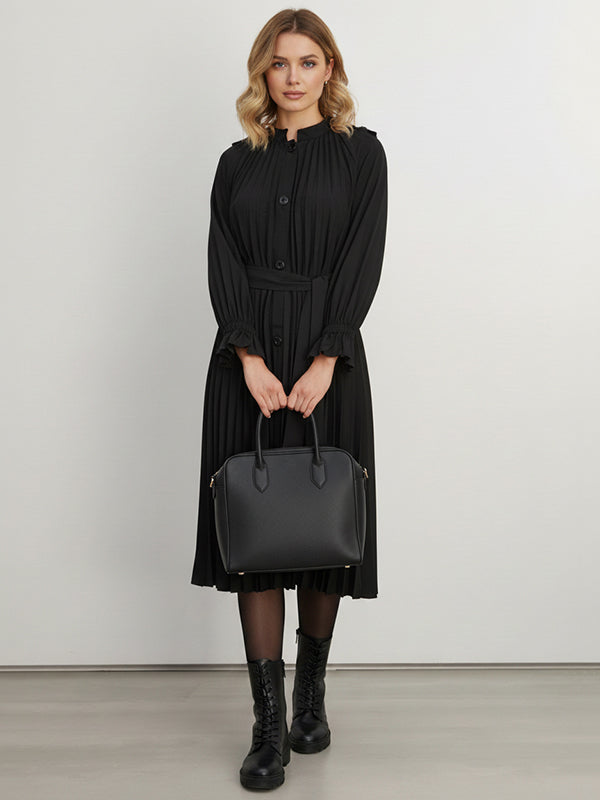 Flared Sleeves Long Sleeves Buttoned Ruffled Solid Color Tied Waist Stand Collar Midi Dresses