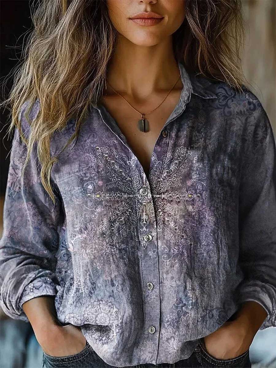 Long Sleeves Loose Buttoned Contrast Color Printed Split-Joint Lapel Blouses&Shirts Tops