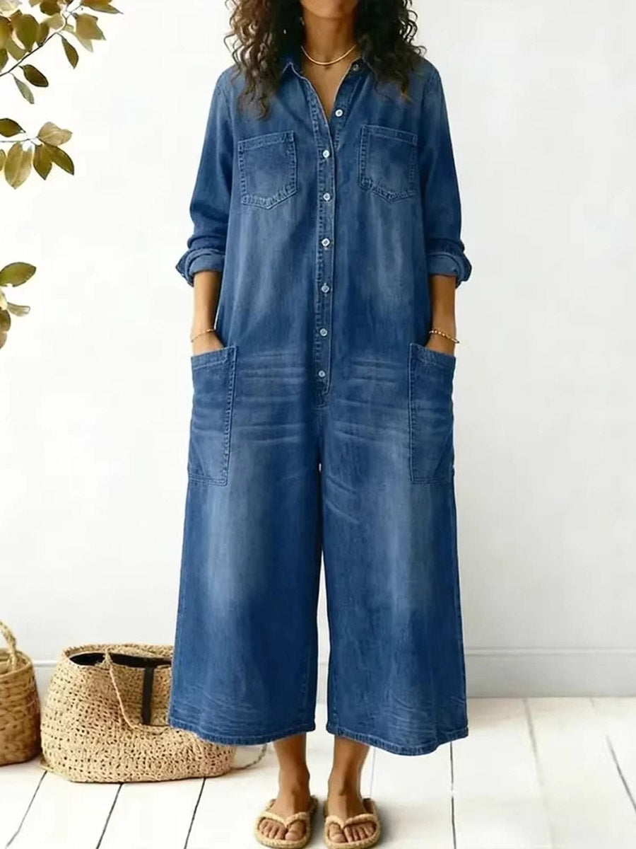 Long Sleeves Loose Buttoned Pockets Solid Color Split-Joint Lapel Jumpsuits