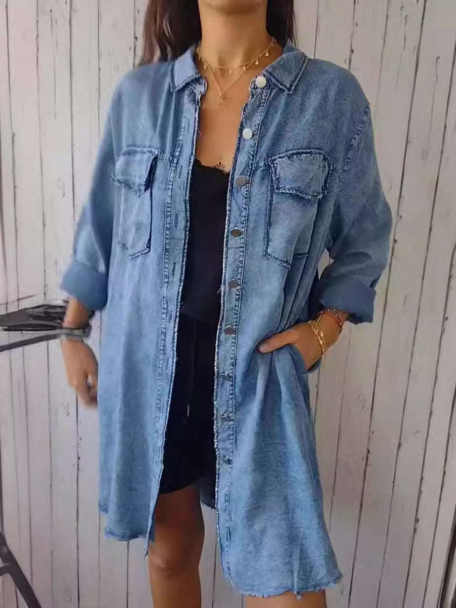 Long Sleeves Loose Buttoned Pockets Solid Color Split-Joint Lapel Outerwear