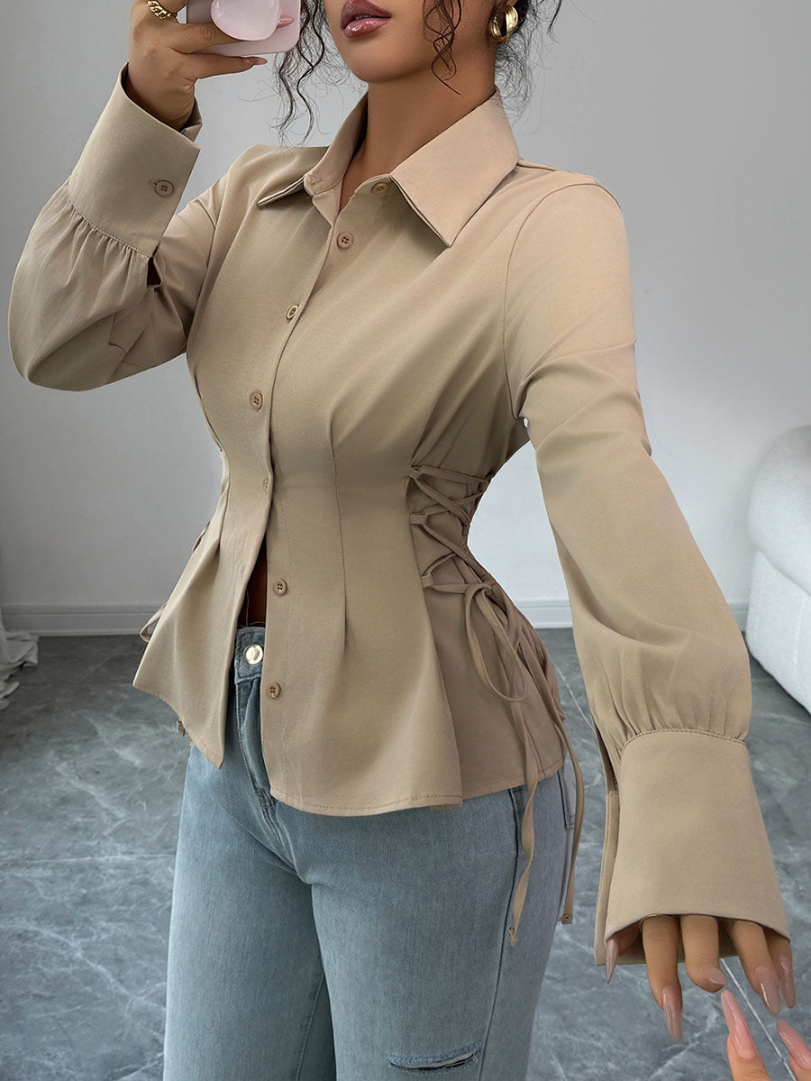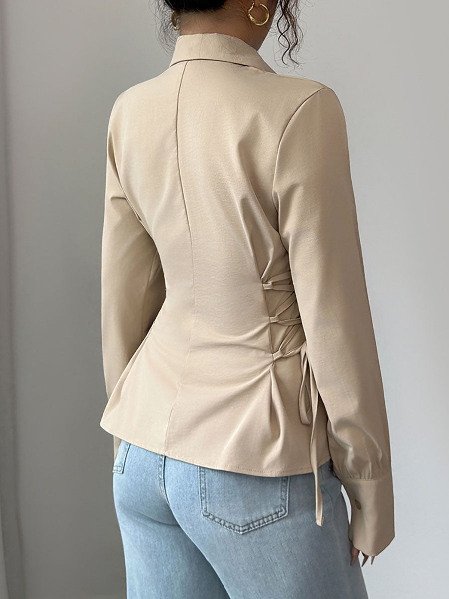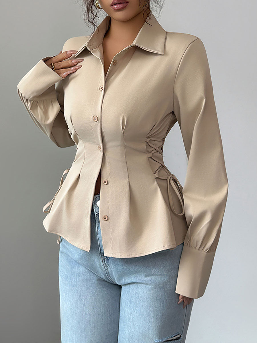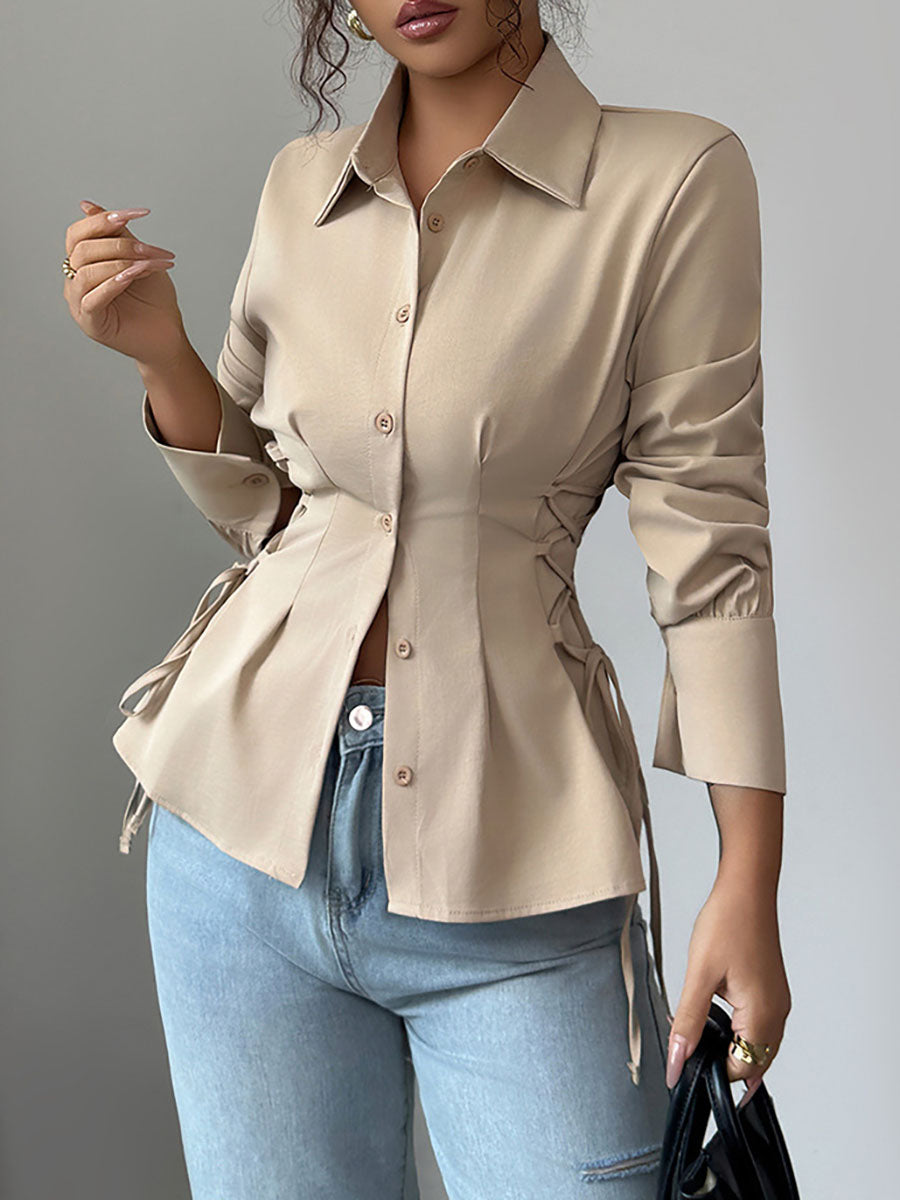 Long Sleeves Puff Sleeves Buttoned Pleated Solid Color Tied Lapel Blouses&Shirts Tops