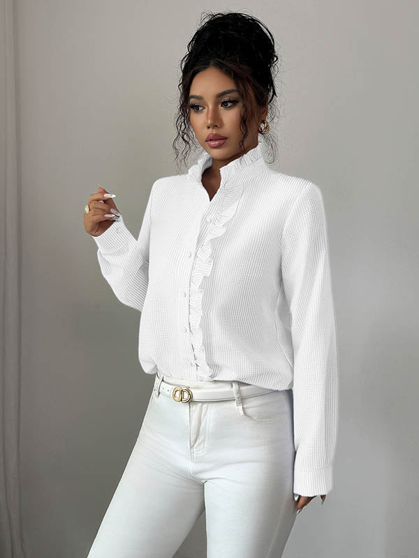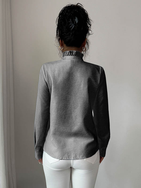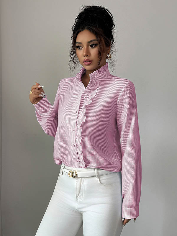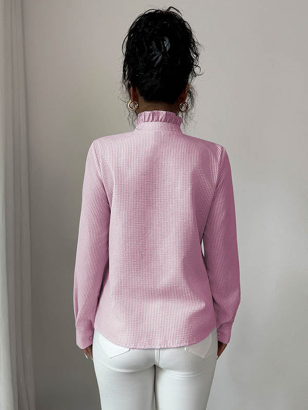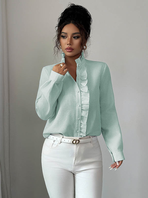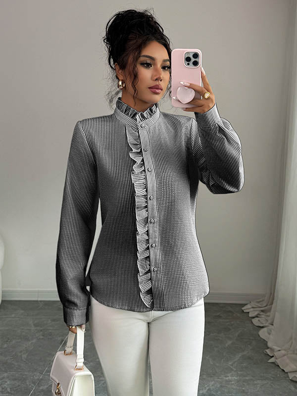 Long Sleeves Skinny Buttoned Ruffled Split-Joint Striped Stand Collar Blouses&Shirts Tops