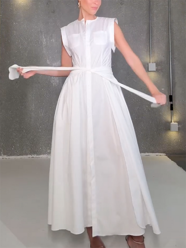 キャップスリーブゆるいボタン付きソリッドカラースプリットサイド縛られたウエストマキシドレスシャツドレス