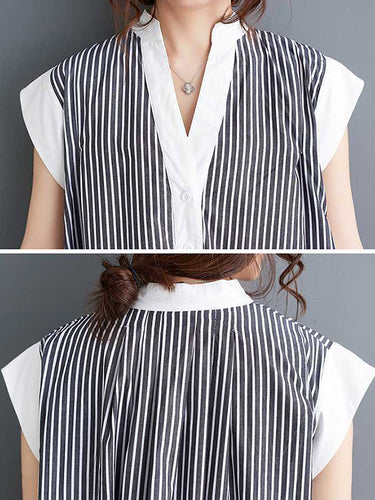 キャップスリーブルーズボタン張りのストライプラペルマキシドレスシャツドレス
