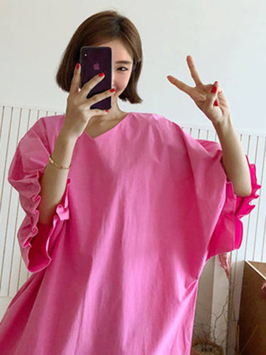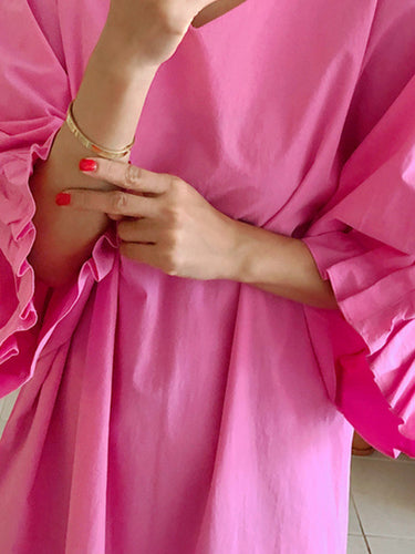 因果的プラスサイズプリーツラグランスリーブVネックミディドレス
