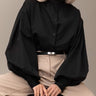 ルーズパフスリーブプリーツソリッドカラースプリットジョイントスプリットサイドスタンドカラーブラウス