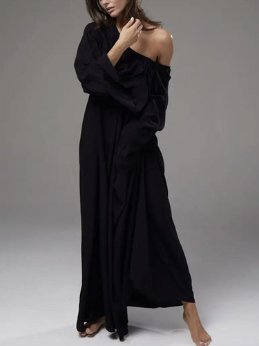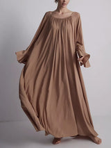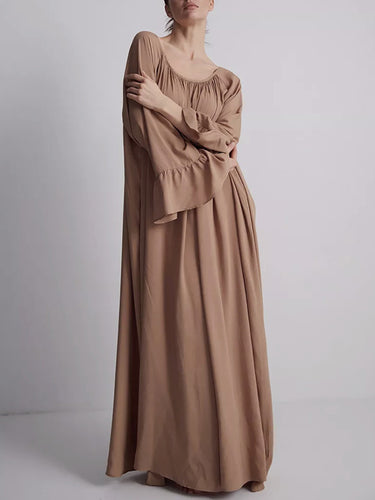 A-lineフレアスリーブプリーツソリッドカラースプリットジョイントラウンドネックマキシドレス