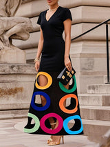 AラインハイウエストコントラストカラーホローVネックマキシドレス