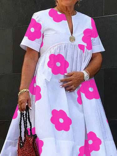 A-lineルーズフラワープリントプリーツスプリットジョイントラウンドネックミディドレス