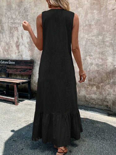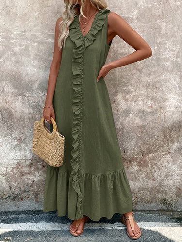 A-lineのゆるいプリーツフリルトリムソリッドカラーvネックマキシドレス