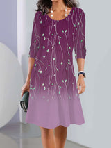 長袖フラワープリントマルチカラープリントラウンドネックMIDIドレス