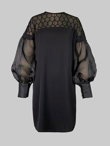 長袖ゆるい中空のソリッドカラースプリットジョイントラウンドネックミニドレス