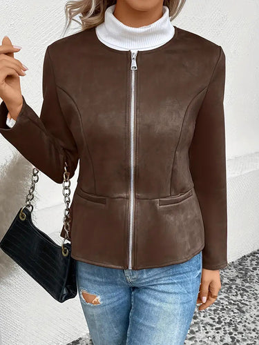 長袖ルーズポケットソリッドカラースプリットジョイントジッパーラウンドネックジャケットアウターウェア