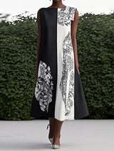 ゆるいノースリーブの非対称コントラストカラー印刷されたラウンドネックマキシドレス
