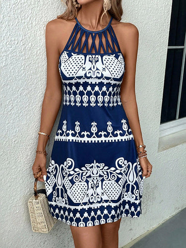 ゆるいノースリーブの中空印刷されたスプリットジョイントホルターネックミニドレス