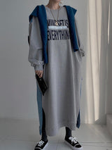 オリジナルのルーズロングスリーブレタープリントスプリットサイドスプリットジョイントラウンドネックミディドレス