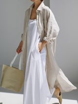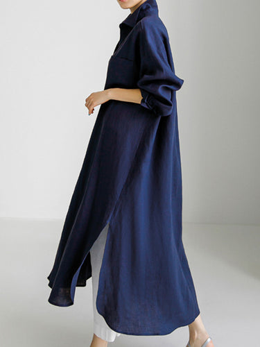 シンプルなロングスリーブスプリットサイドソリッドカラーラペルミディドレスシャツドレス