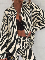 Zebra-Stripe Plusサイズのラペルブラウストップ +パンツボトム2個セット