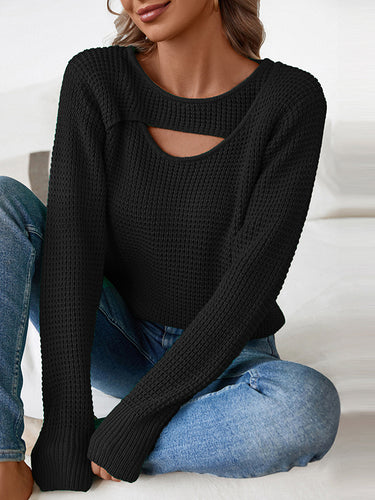 長袖ゆるい中空のソリッドカラースプリットジョイントラウンドネックプルオーバーセータートップス